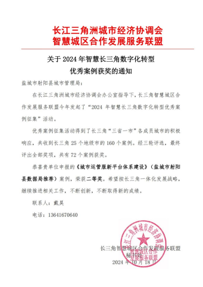在長三角智慧城區(qū)合作發(fā)展服務(wù)聯(lián)盟今年發(fā)起的2024 年智慧長三角數(shù)字化轉(zhuǎn)型優(yōu)秀案例征集大賽中,射陽縣城市管理局申報的《城市運管服新平臺體系建設(shè)》案例,成功摘得二等獎殊榮。