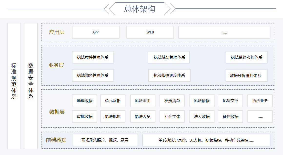 根據總體建設目標,萬州區智慧城管綜合執法系統的總體架構可以歸納為“1+3+6”,“1”即建設一套標準規范體系,“3”是實現三屏融合的統一門戶,“6”是指萬州區智慧城管綜合執法系統的六大體系,最終實現“感知、分析、服務、指揮、監察”五位一體目標。